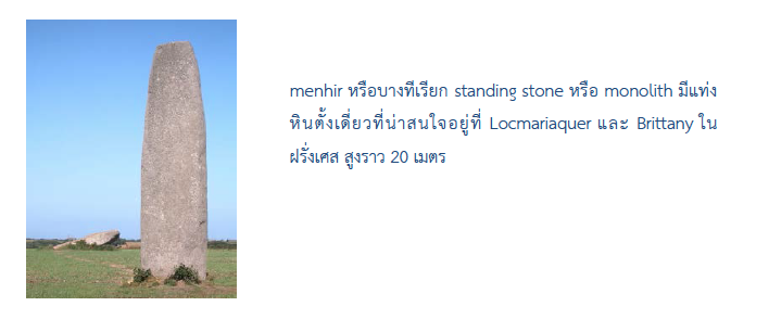 1. หินตั้งเดี่ยว (menhir) มีลักษณะสูงมากกว่า 64 ฟุต